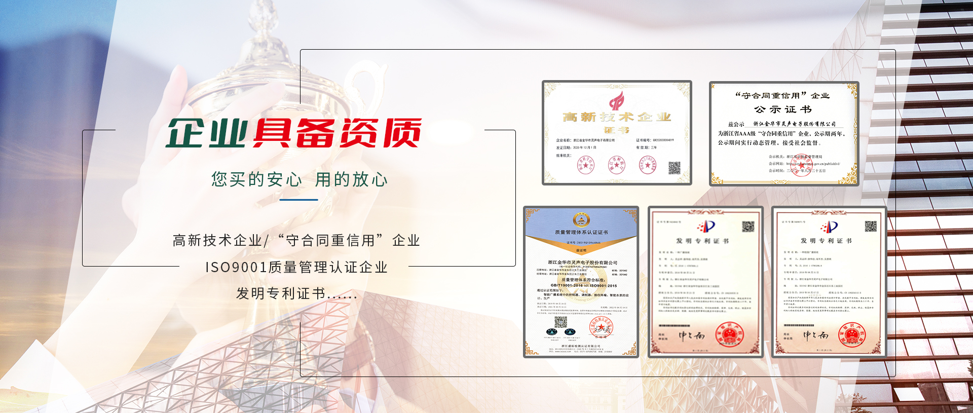 公司2001年通過ISO9001:2008國(guó)際質(zhì)量管理體系認(rèn)證、ISO14001:2004環(huán)境管理體系認(rèn)證,相關(guān)產(chǎn)品通過國(guó)家CCC認(rèn)證及CQC產(chǎn)品質(zhì)量認(rèn)證,并通過國(guó)家廣播電影電視新聞出版總局廣播電視設(shè)備器材入網(wǎng)認(rèn)可。公司注重產(chǎn)品的質(zhì)量與技術(shù)創(chuàng)新,現(xiàn)建有多條先進(jìn)的總裝、檢測(cè)流水生產(chǎn)線及各項(xiàng)檢測(cè)設(shè)備所需的儀器設(shè)備。還擁有全電磁屏蔽室一個(gè),所有高頻產(chǎn)品的調(diào)試均在屏蔽室中進(jìn)行。公司組建了高素質(zhì)的管理隊(duì)伍,設(shè)有研發(fā)部、生產(chǎn)部、銷售部、采購(gòu)部、質(zhì)檢部、售后服務(wù)中心及財(cái)務(wù)部等部分,并與國(guó)內(nèi)多家大專院校、科研單位建立長(zhǎng)期合作關(guān)系,成立了近乎是技術(shù)研發(fā)中心,是金華市職業(yè)技術(shù)學(xué)院重點(diǎn)示范實(shí)習(xí)基地。公司產(chǎn)品先后被浙江、江蘇、重慶、四川、甘肅、山東、湖南、湖北、貴州等文廣新局、電視臺(tái)、氣象局普遍采用,覆蓋全國(guó)各省市800多家縣(市)文廣新局、廣播電視臺(tái),并廣泛采用于教育行業(yè),尤其是在近年來的農(nóng)村應(yīng)急廣播“村村響”工程中,靈聲公司中標(biāo)承建的“村村響”工程贏得了各省市廣播電視劇領(lǐng)導(dǎo)、專家們的一致好評(píng)!